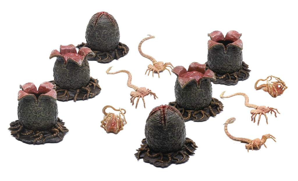 Originally designed by H.R. Giger in his signature biomechanical style, and sculpted in 1/18 scale, this set features six ovomorph (xenomorph eggs) in various stages of release, as well as six facehuggers, ready to infect their prey!