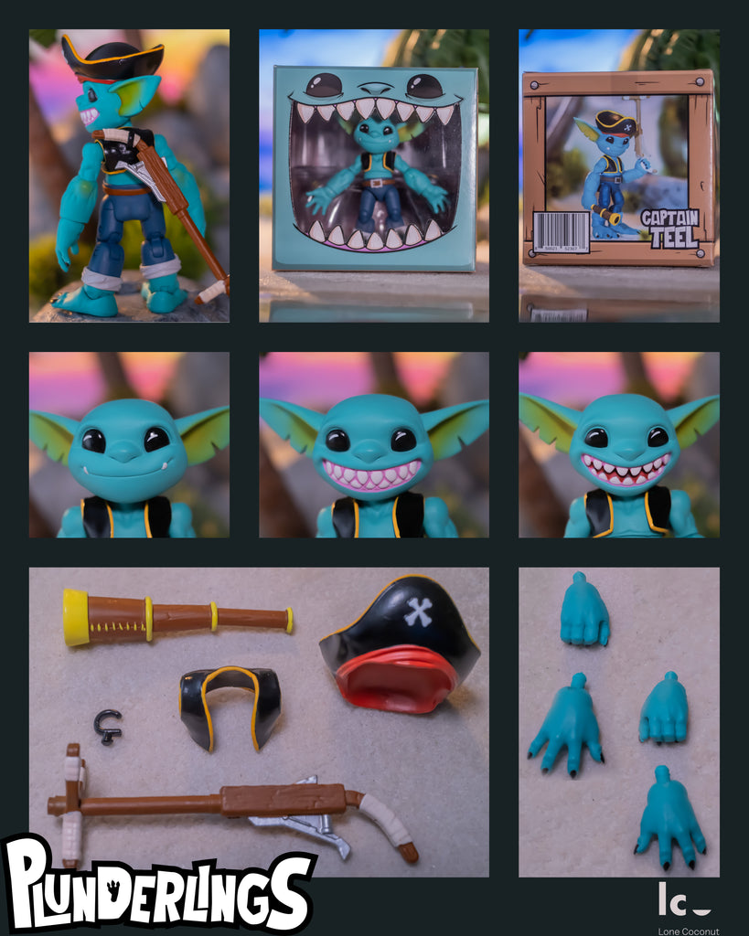 Plunderlings are highly articulated 1/12 pirate-themed monster action figures. Each figure features 3 mischievous expressions, open and gripping hands, and at least 2 accessories. They come in all sorts of tropical colors, customize your own Pirate crew with your choice of Nomads, Ferals and Captains.