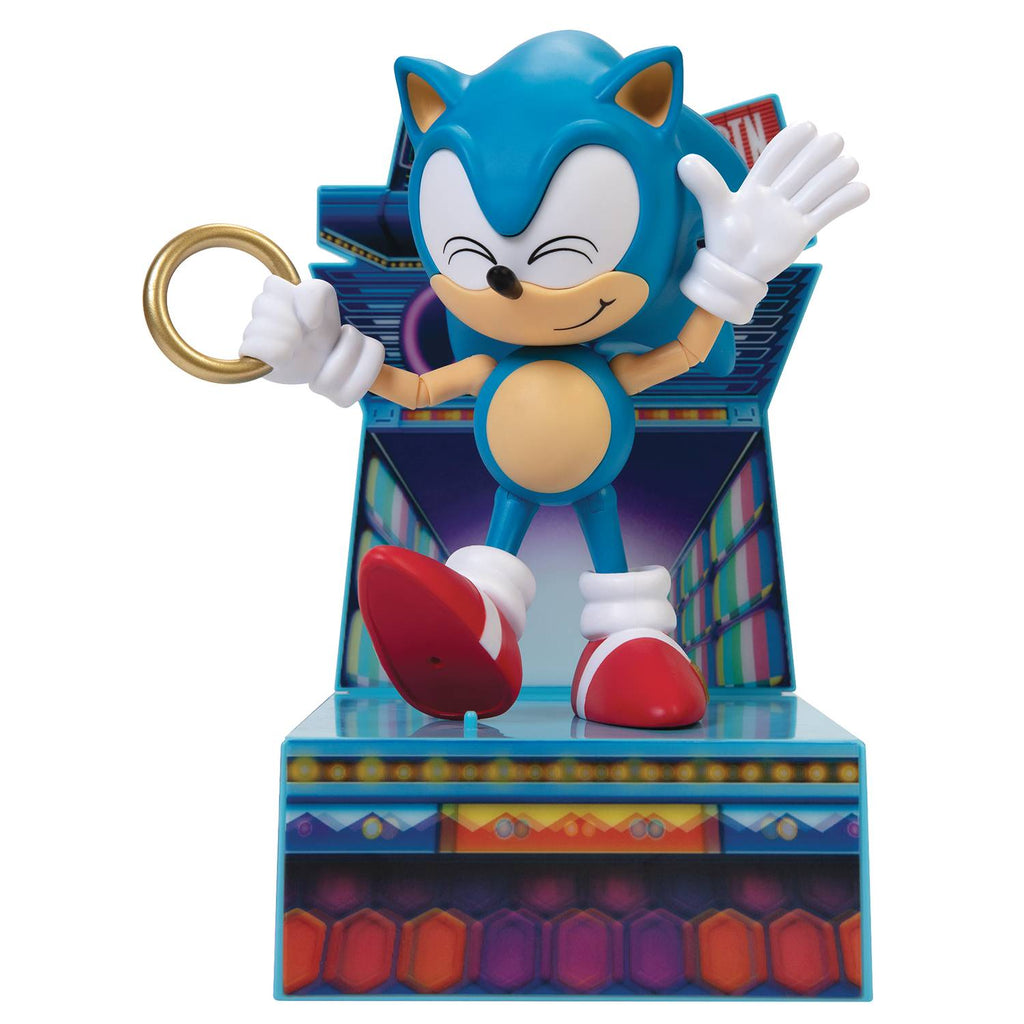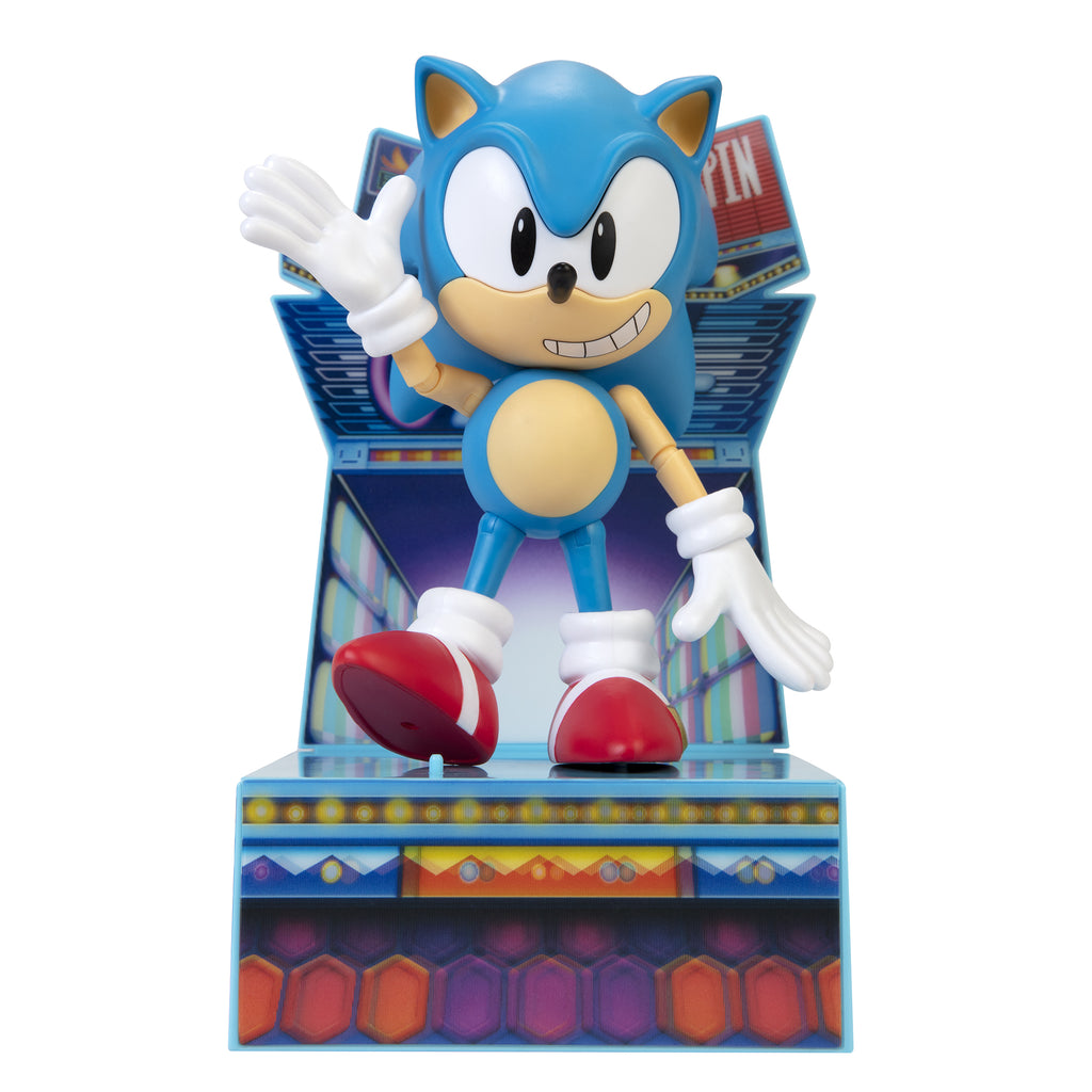 This new figure features classic Sonic styling, measures 6" tall and includes interchangeable faces, eyes, hands and a display base with lenticular scene!