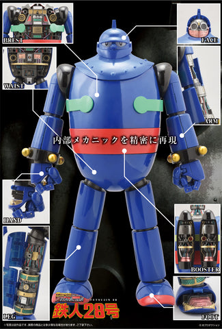 From the classic anime Tetsujin 28-go comes a highly detailed figure of Tetsujin 28, standing nearly 13" tall with multiple hatches revealing his internal mechanisms, various points of articulation and LED eye lights (batteries not included).