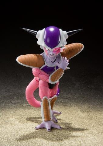 Standing a powerful 4 1/4" tall, the figure features all of the posability fans have come to expect from S.H.Figuarts. A detachable Scouter and Supernova effects let you recreate your favorite scenes. And Frieza's pod, a toy-series first, is rendered in accurate detail. To capture the appearance from the original design, Frieza's upper body can be removed from the figure and be set into the pod. Set contains Main Body, Four Optional Expression Parts, Optional Head, Two Pairs of Optional Hands, Scouter, Namekian Dragon Ball (5-star), Supernova Effect Parts, Frieza's Pod, Frieza's Pod Stand.