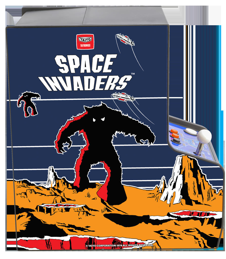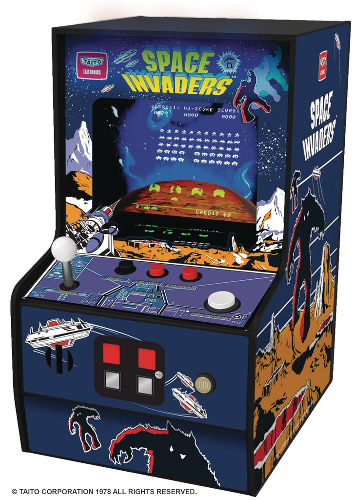 Originally released in 1978, Space Invaders impact was revolutionary, becoming an instant global phenomenon among arcade enthusiasts and introducing many others to video games. This Miniature playable replica of the original Space Invaders arcade cabinet features volume control and 3.5mm headphone jack, plus a backlit marquee and coin trap. Requires a micro USB cable or 4 AA batteries (not included).