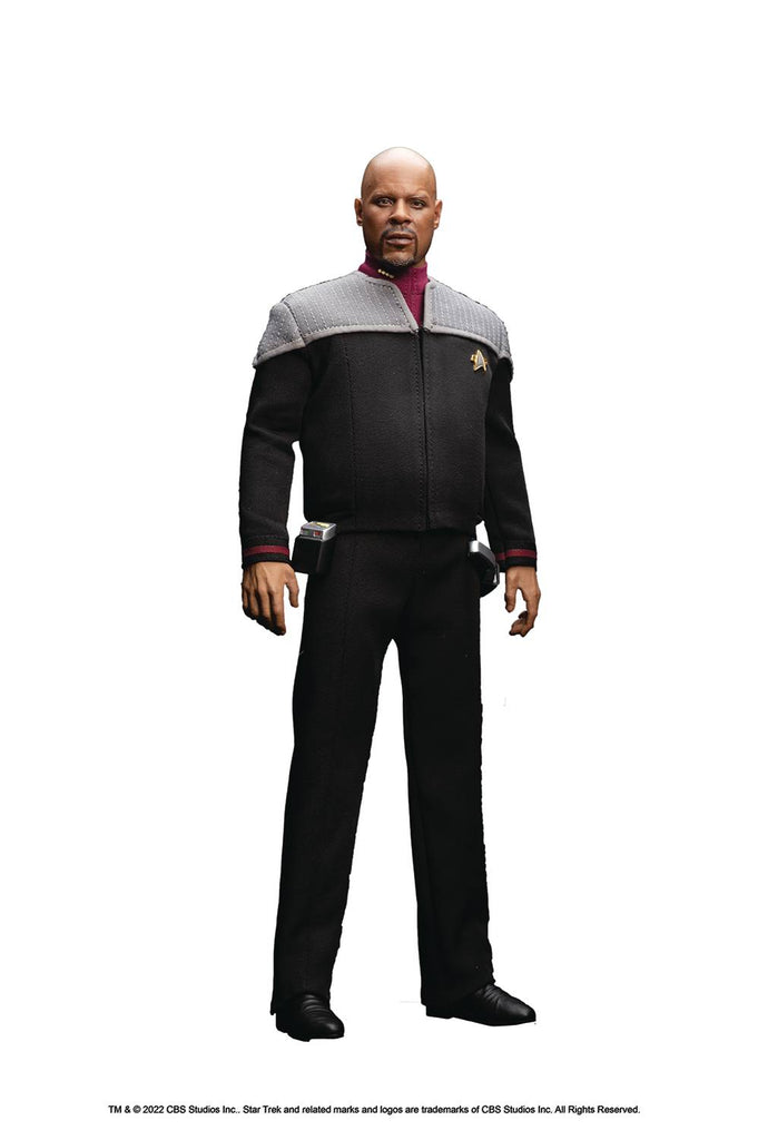 From Newson International. Portrayed by the talented Avery Brooks, Captain Benjamin Sisko is one of the most complex characters to come out of Star Trek. This 1/6-scale Essential Edition figure presents Captain Sisko from Season 6 in exquisite detail. Standing approximately 12" tall with all-new body designed by EXO-6 that features more than 30 points of articulation, he wears the later "movie" uniform, each element of the outfit authentically reproduced. The original portrait sculpt of Brooks has a hand-painted likeness and multiple costume pieces are included so the look from the classic episode In the Pale Moonlight can be recreated. Starfleet accessories include a Type II hand phaser, TR-590 Tricorder X; and PADD. Additional items include his baseball and his whiskey glass, six interchangeable hands, a hexagonal display base featuring the transporter pad with two different floor inserts, and an informational card that can used to get an autograph from the performer and display with the figure.