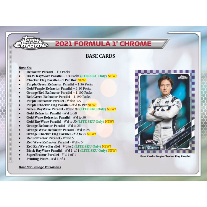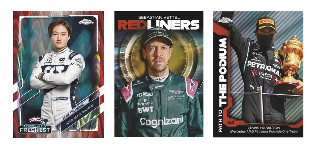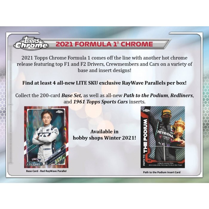 The 2021 Topps Chrome Formula 1 Series comes off the line with another hot chrome release featuring top F1 and F2 Drivers, Crewmembers and Cars on a variety of base and insert designs! Find at least 4 all-new LITE SKU exclusive RayWave Parallels per box! Collect the 200-card Base Set, as well as all-new Path to the Podium, Redliners, and 1961 Topps Sports Cars inserts.
