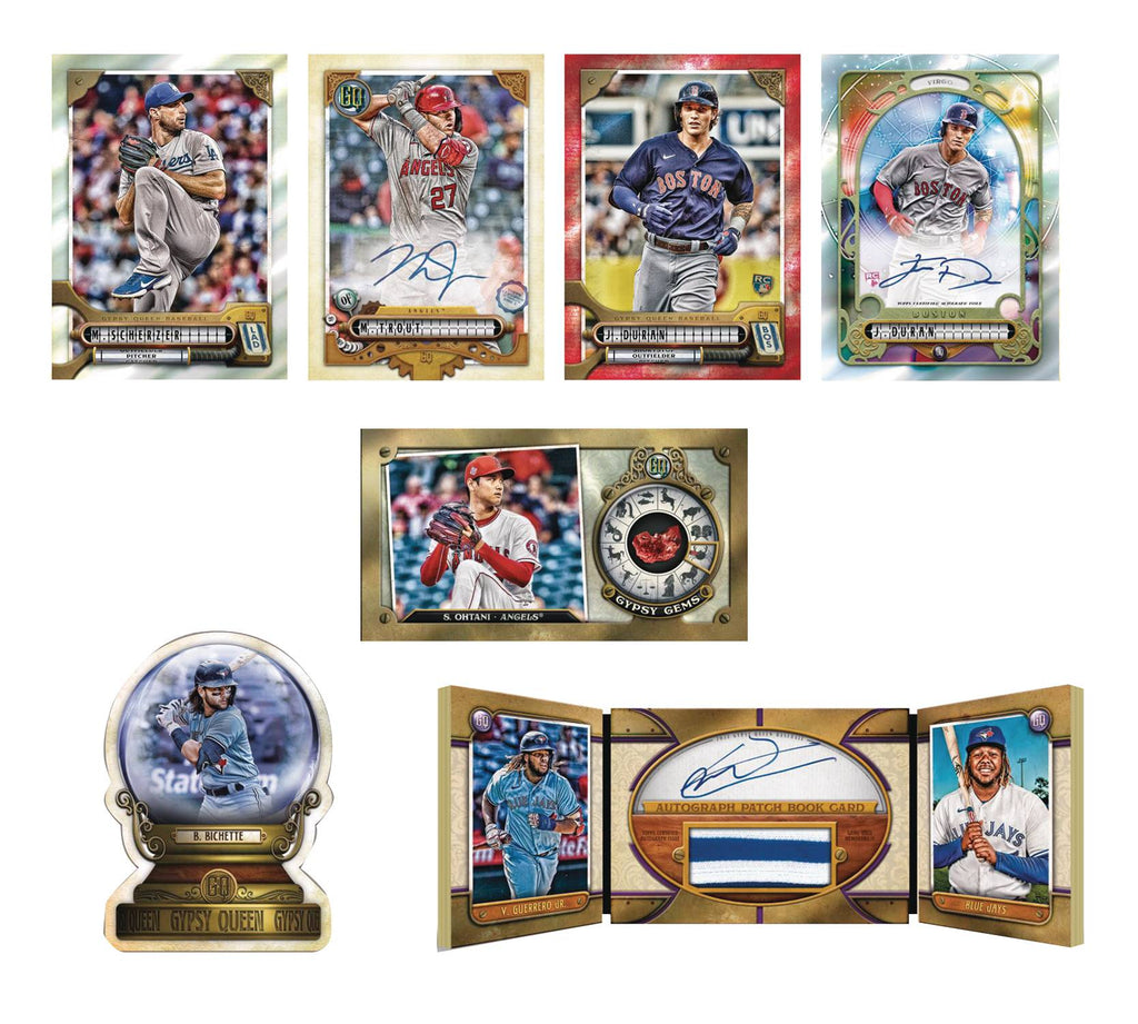 From Topps Company. 2022 Topps Gypsy Queen once again blends a beautiful arrangement of unique designs with an astounding checklist of the game's top players and rookies! Look into the future with all-new Crystal Gazing Die-Cuts or collect precious foil Gypsy Gem Minis along with an all-new 300-card Base Set. 2 Autographs and 3 Exclusive Gypsy Queen Chrome Cards per box!