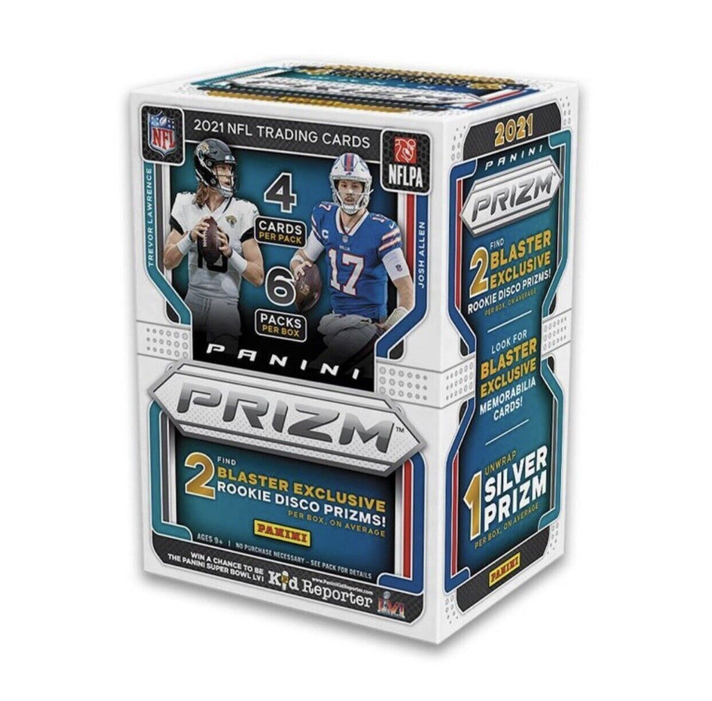 2021 Panini Prizm Football Blaster Box - 6 Packs per box, 4 cards per pack - Find 2 Blaster Exclusive Rookie Disco Prizms per box on average. - 1 Silver Prizm per box on average - Look for Blaster exclusive memorabilia cards