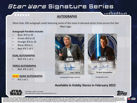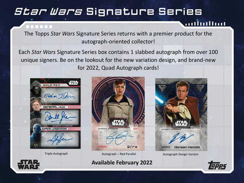 From Topps Company. The Topps Star Wars Signature Series returns with a premier product for the autograph-oriented collector! Each Star Wars Signature Series box contains 1 slabbed autograph from over 100 unique signers. Be on the lookout for the new variation design, and brand-new for 2022, Quad Autograph cards!