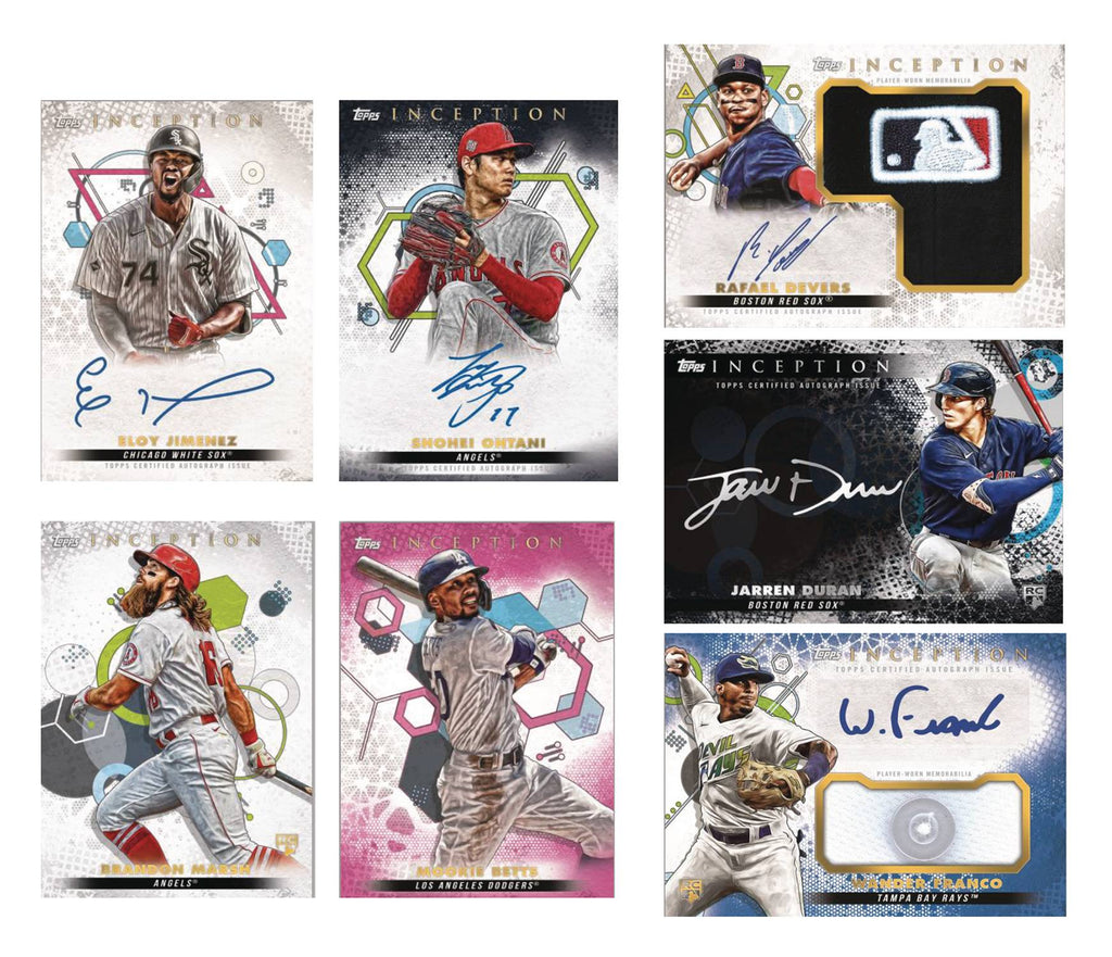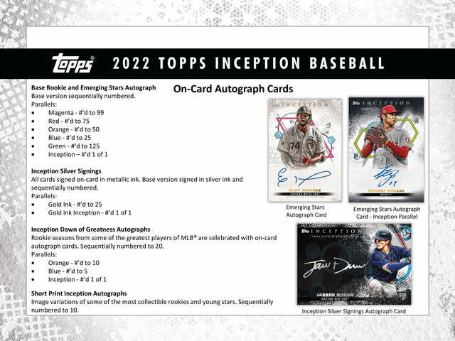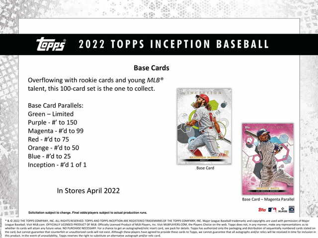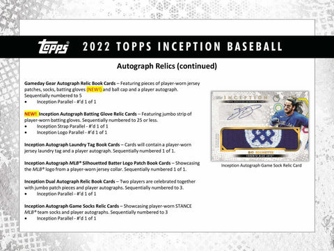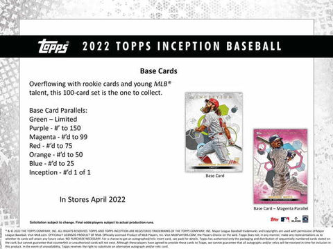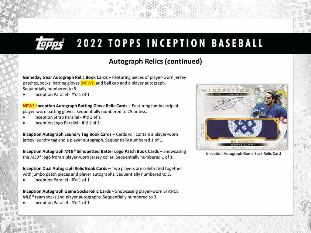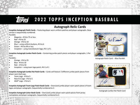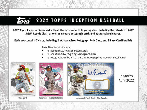 From Topps Company. The 2022 Topps Inception Series is packed with all the most collectible young stars, including the talent-rich 2022 MLB Rookie Class, as well as on-card autograph cards and autograph relic cards! Each box contains 7 cards, including: 1 Autograph or Autograph Relic Card, and 2 Base Card Parallels.