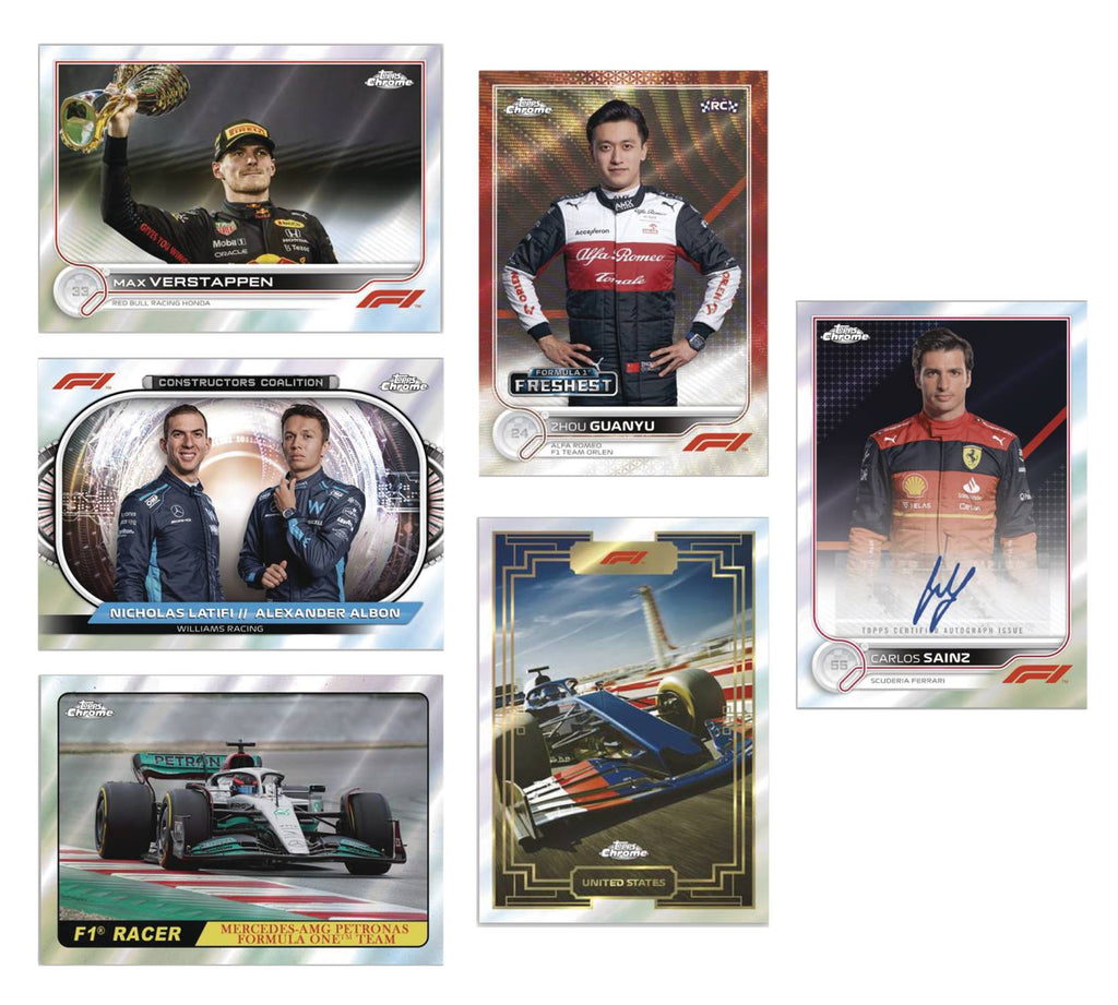 From Topps Company. 2022 Topps Chrome Formula 1 sets off from the front of the grid with an exciting chrome release featuring top F1 and F2 Drivers Grand Prix winners, and Cars on a selection of base and insert designs!  Watch out for Chrome Autograph Cards featuring top F1 & F2 Drivers and Crew! Collect the 200-card Base Set, as well as all-new Constructors Coalition, Speed Demons and Art du Grand Prix inserts.
