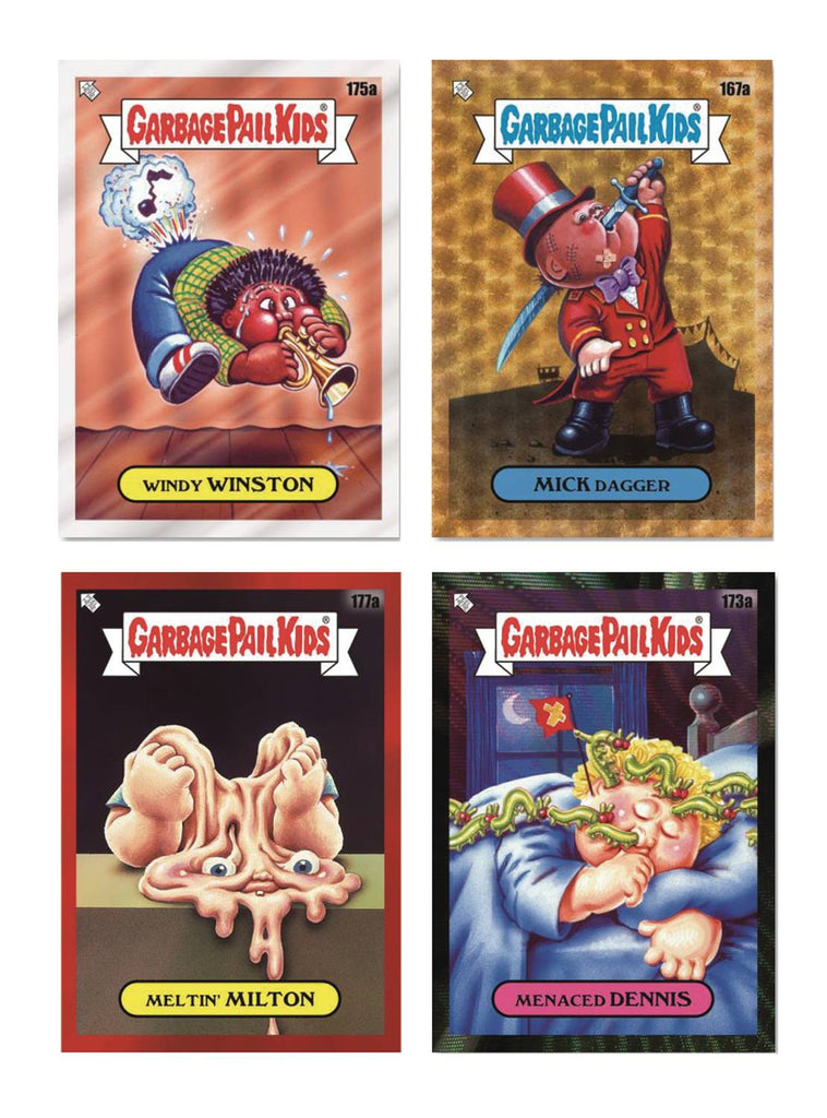 From Topps Company. The always classic GPK Original Series 5 set gets a fresh coat of chrome with the release of 2022 Garbage Pail Kids Chrome! Collect the Base Set consisting of Original Series 5 art, as well as all new art pieces of classic Garbage Pail Kids characters!  Look for Rare Artist Autograph Cards, C Name Variations, Exclusive Parallels and the Super Rare "No Blue Ink" Variations!