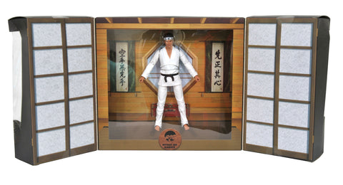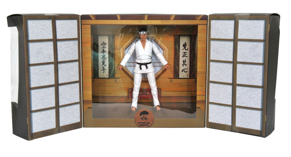 From Diamond Select Toys. Strike Fast! Strike Hard! No Mercy! Fans of the Netflix series Cobra Kai can enter their favorite dojo with this debut box set of Cobra Kai action figures! The front of the box shows Johnny Lawrence and John Kreese in the Cobra Kai dojo, but open it up farther and see Daniel LaRusso in the Miyagi-Do Karate dojo!