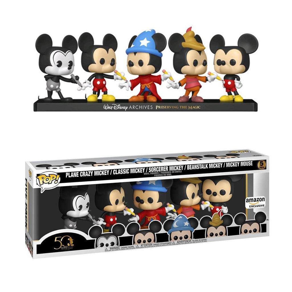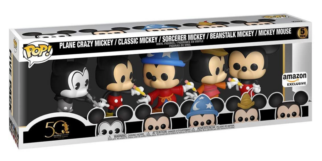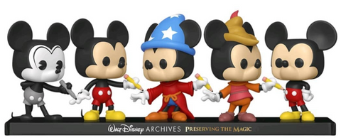 This 5 pack of figures comes on a singular commemorative base. The figures are about 3.75 inches tall and feature Mickey Mouse from different eras.