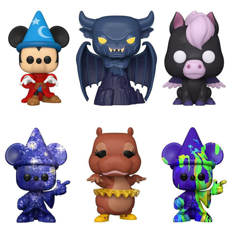Collect Sorcerer Mickey, Menacing Chernaborg, Peter Pegasus, Hyacinth Hippo, and a modern Mickey Art Series design!