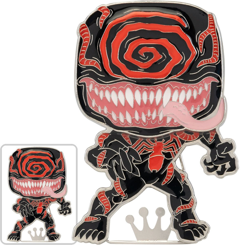 This Corrupted Venom Large Enamel Pop! Pin measures approximately 4 1/2-inches tall, just like the Pop! Vinyl Figure it's based on. Not only does the pin have the standard pin backings so you can attach it to bags or a cork board; it also has a "Funko Crown" pin stand allowing it to stand up for a dynamic display! True to it's namesake, the head is raised making it pop from the body. This large Pop! Pin comes packaged in a window display box.