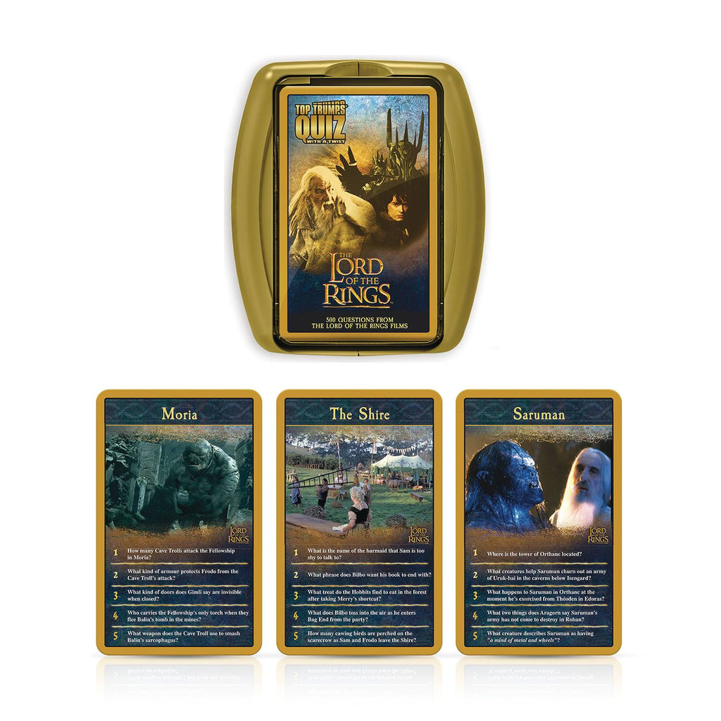 From Top Trumps. One does not simply answer all 500 questions in TOP TRUMPS QUIZ: Lord of the Rings correctly on the first try! Give your sword-arm a rest and test your cunning and intellect with this tricksy game, which covers all three Lord of the Rings films. Each card contains high-quality photography and stills from the movies, and categories cover characters, locations, creatures and the world and history of Middle Earth. Remember which city lies between the Mountains of Mordor and Minas Tirith? Then it's time to gather your very own Fellowship and assemble a quiz night to remember.