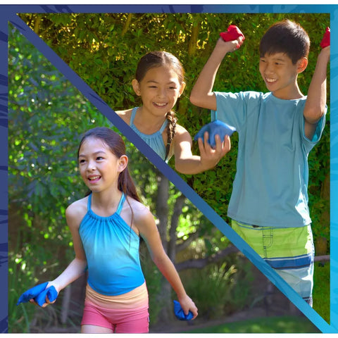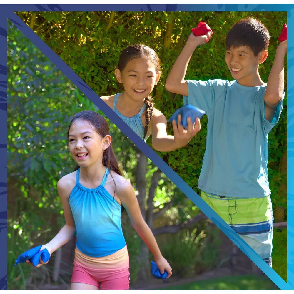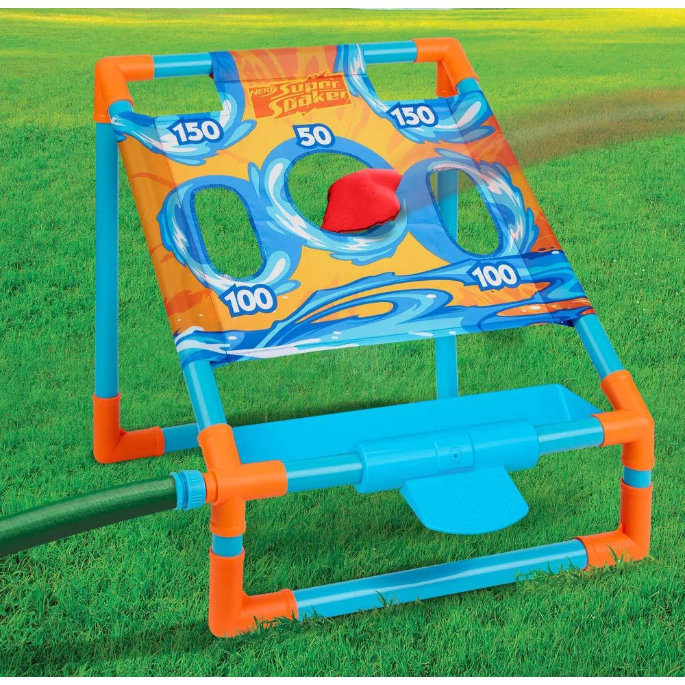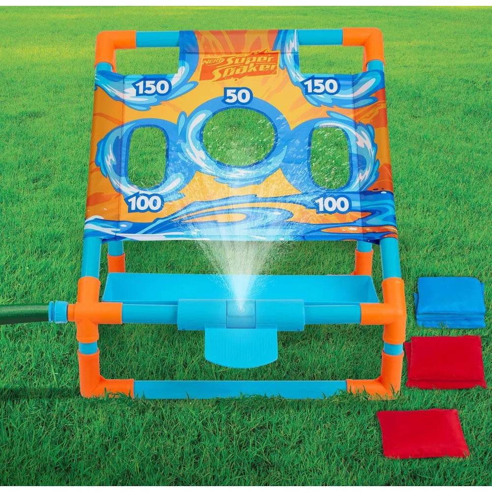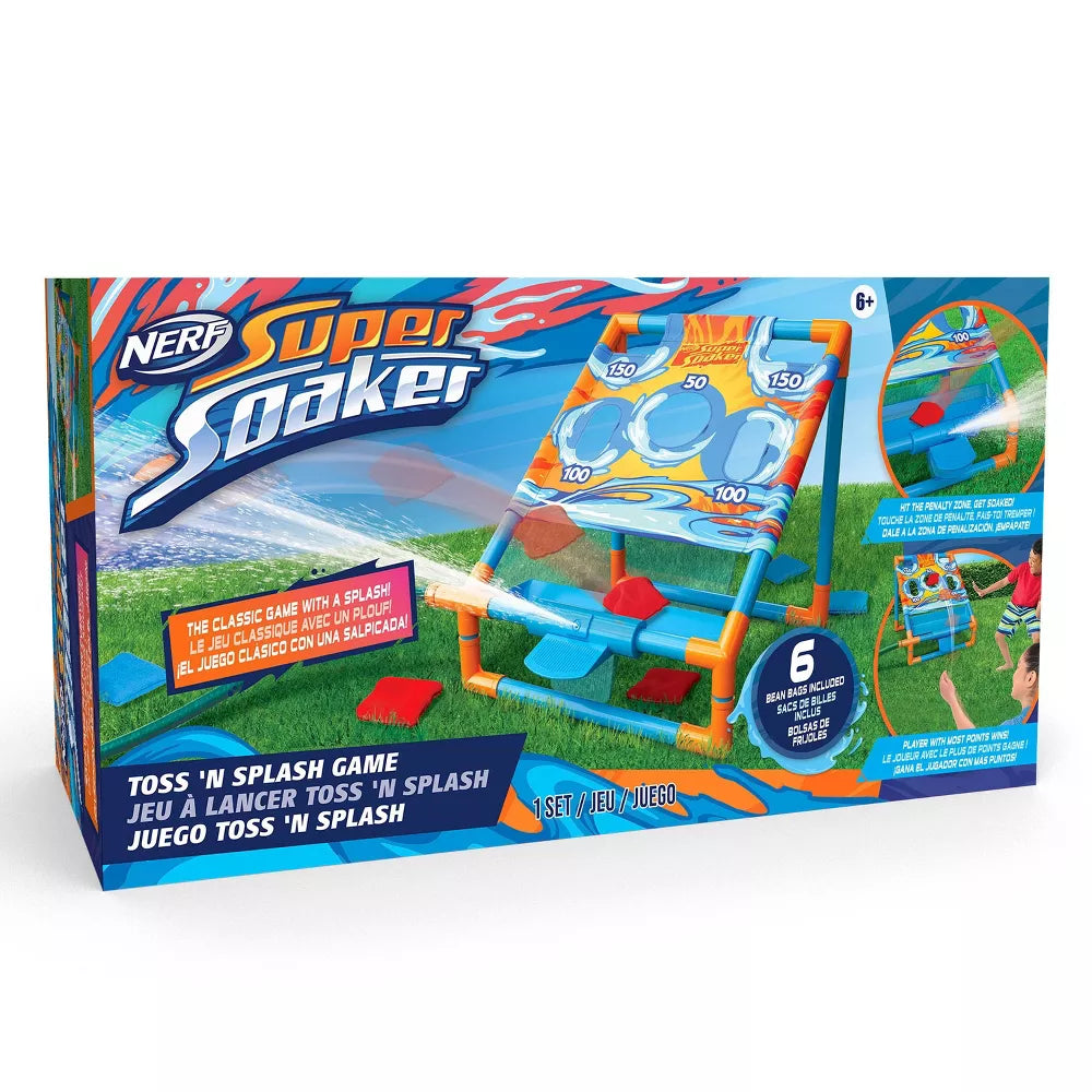 Family favorite bean bag toss game with a splashy twist! All-new from WowWee, the Super Soaker Toss ‘N Splash is the bean bag toss game that loves to get you soaked! Just like traditional bean bag toss, players toss bean bags at a target, trying to score points. But now, if you accidentally hit the penalty zone, you’ll get SOAKED! Toss bean bags at the 50, 100 and 150 point zones. If you miss and hit the penalty zone, water starts spraying, but you still have to finish tossing all your bean bags. The penalty zone is easy to reset after each round, and the first player to 300 points wins. The frame easily attaches to your hose, and the target and bean bags are made of water resistant nylon fabric that dries quickly. Fun for the entire family, you can play Toss ‘N Splash solo or in teams. It’s a blast for everyone 6+. Included in your Toss ‘N Splash Game are 1 Fabric Board target, 1 Penalty Zone tray, 6 Bean Bags, 9 Tubes, 7 Connectors, 1 Hose Adapter and an instruction manual. Some assembly required.