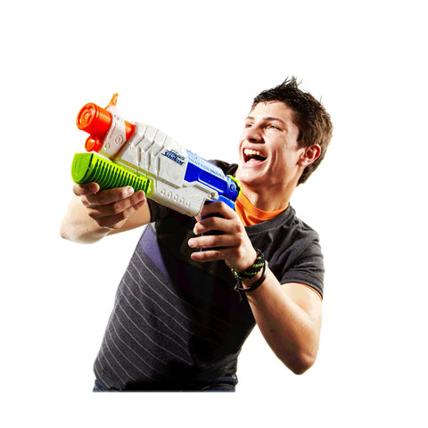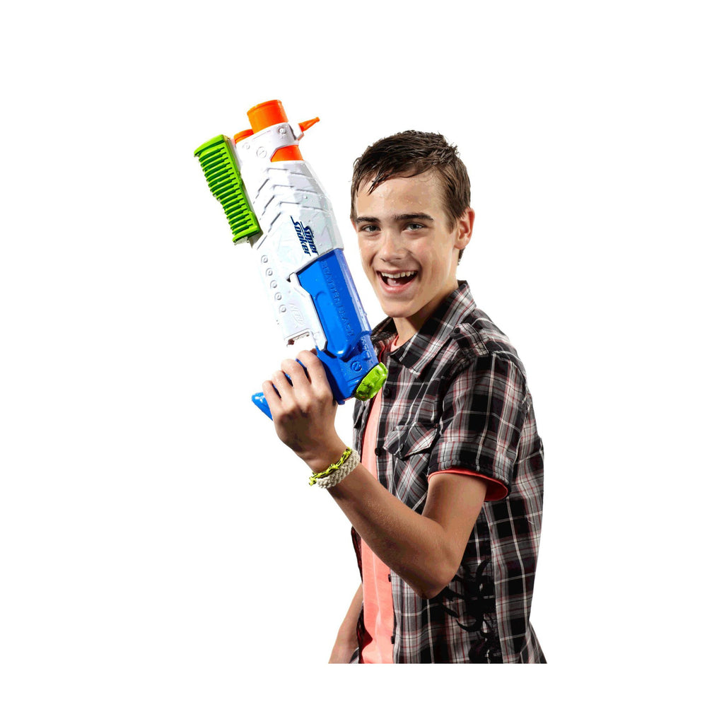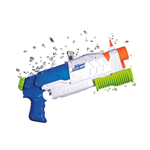 Get ready for 5 times the fun with the soaking action of the Super Soaker Scatter Blast water blaster! This blaster's powerful pump-fire action and 5-nozzle blast lets battlers launch 5 streams of water at their target! It can hold up to 22 fluid ounces (650 milliliters) of water and has a flip-up sight for targeting. Slide the pump handle forward and pull it back to unleash a scatter-spray attack at unsuspecting opponents!
