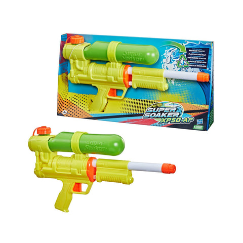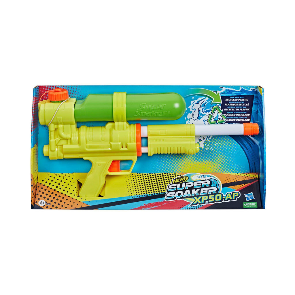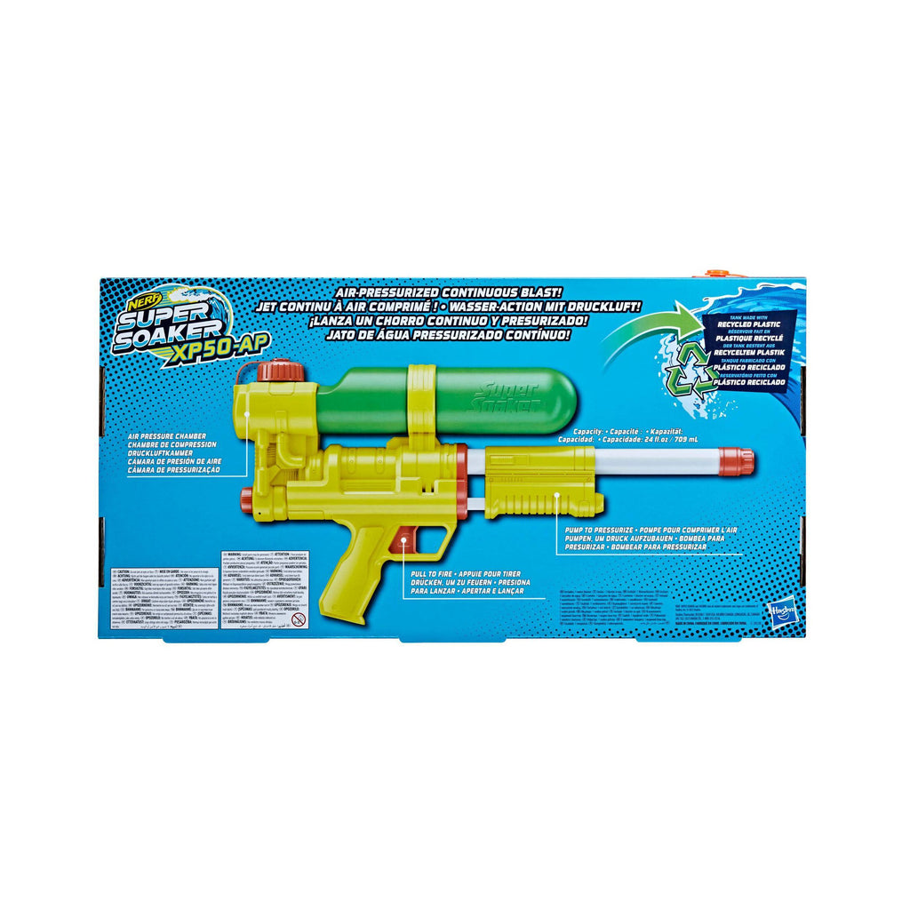 "This Nerf Super Soaker water blaster has a tank made with recycled plastic bottles, and comes in a recyclable, paper-based package which is plastic-free except for tape and glue. At Hasbro, we’re passionate about protecting our planet and conserving its natural resources. We believe every package makes a difference -- please recycle this one. With this Nerf Super Soaker XP50-AP blaster, you can experience the water-drenching fun that started it all, because it features the original air-pressurized water launching mechanism and classic styling. It's a splashtastic blast from the past for today’s water warriors! Fill the tank, pump the handle to pressurize the tank, then pull the trigger to unleash a continuous, air-powered blast of water. Soak up the fun and pour on the air-pressurized power of the Nerf Super Soaker XP50-AP blaster! Tank capacity is approximately 24 fluid ounces (709 milliliters).