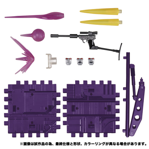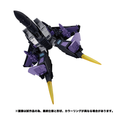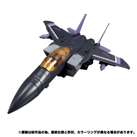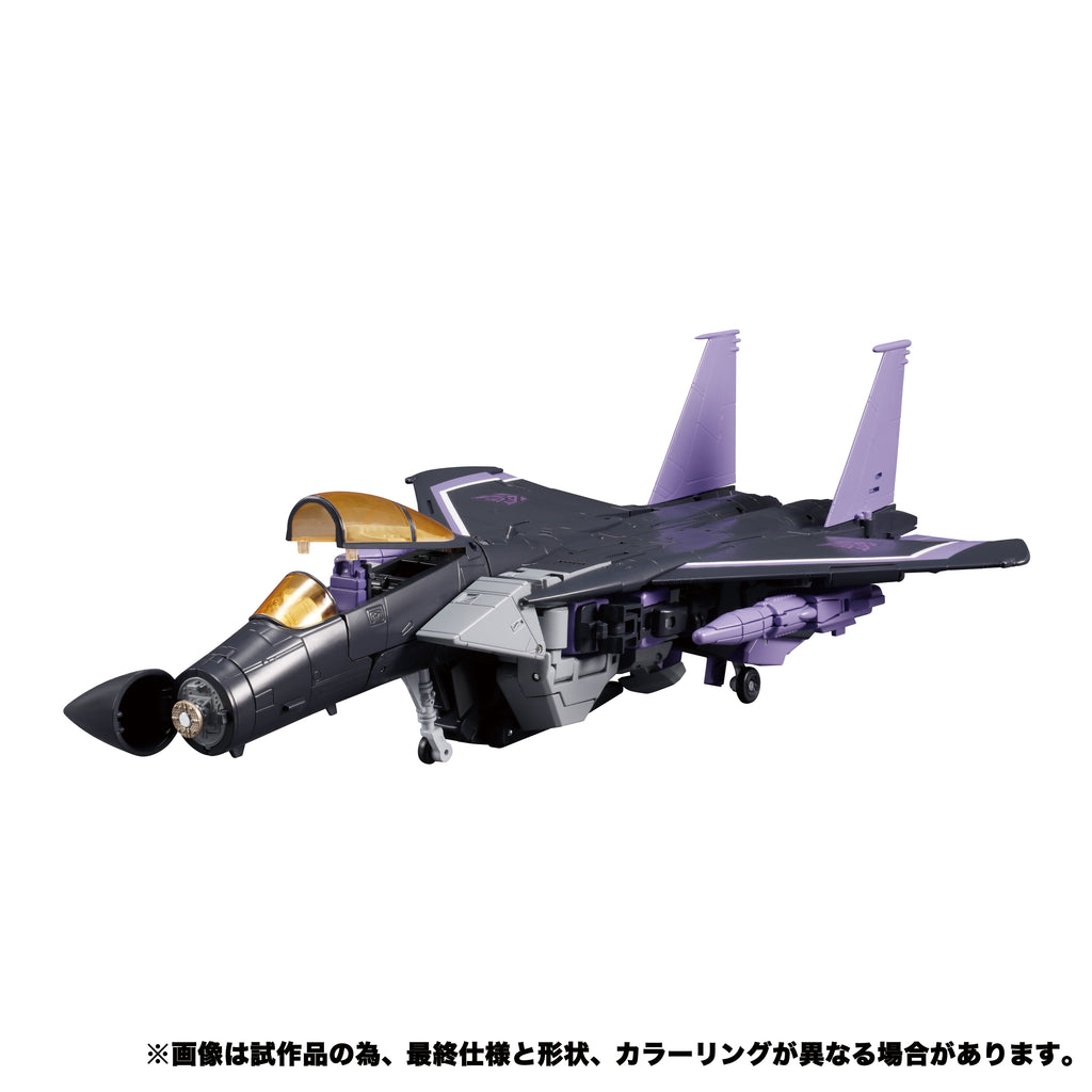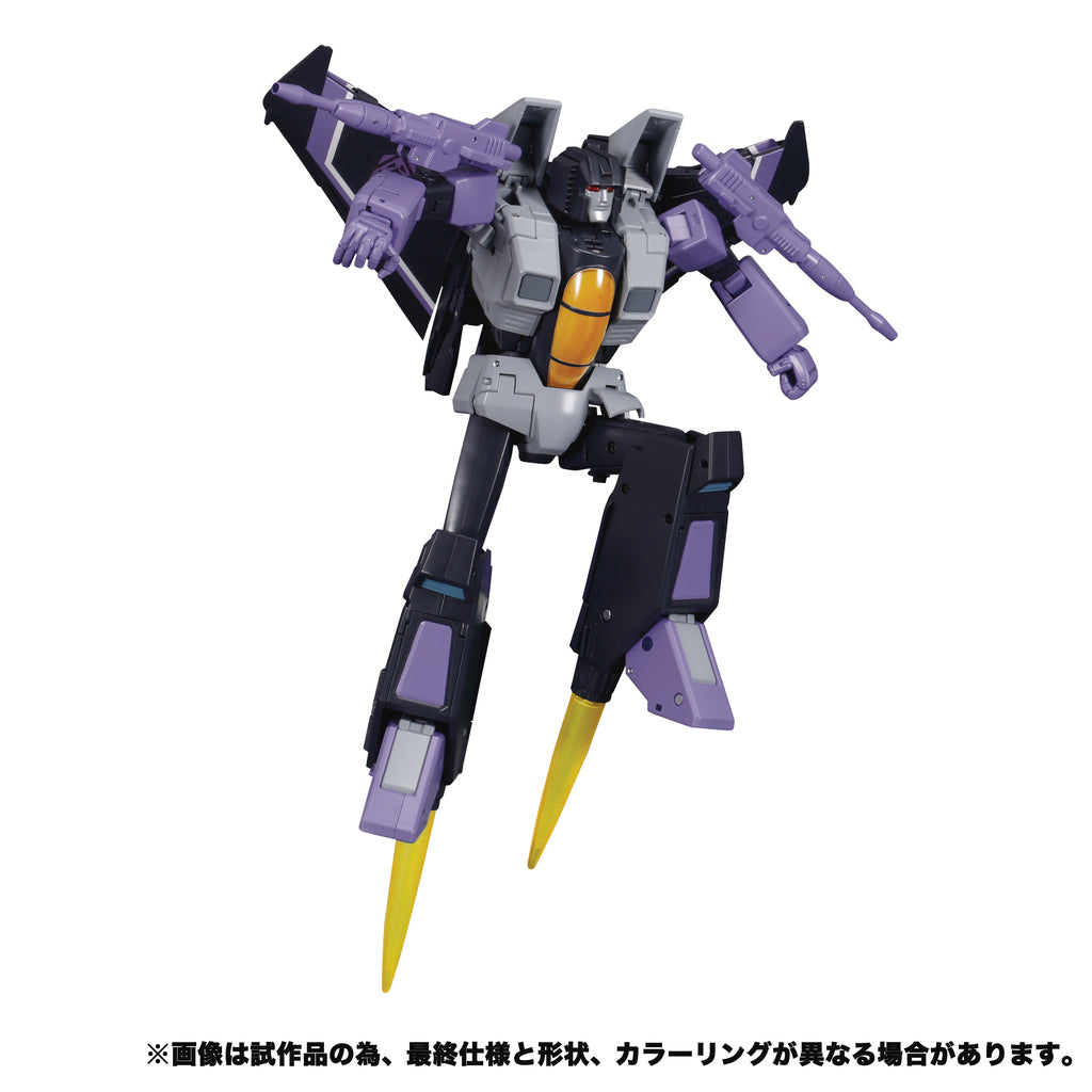 Destron warrior Thundercracker from animated television show The Transformers, joins the Masterpiece collection from Hasbro! The F-15 Eagle aircraft is officially licensed by Boeing, and the fully-poseable Thundercracker can easily recreate dynamic poses from the show! In Robot mode, the vertical stabilizer and the horizontal stabilizer can be stored in the main body. Thundercracker includes plenty of parts: 3 types of replacement faces and 5 types of effects!