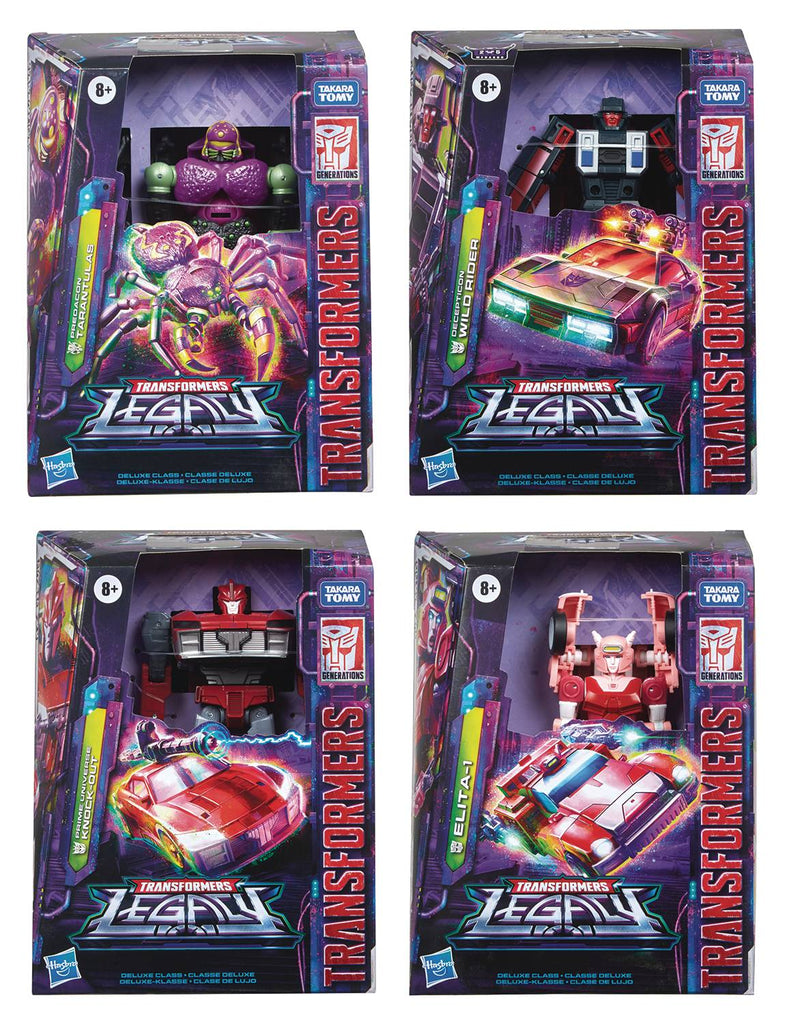 From Hasbro Toy Group. Universes collide with Transformers: Legacy! This epic line of Transformers toys brings together fan-favorite characters from across the Transformers multiverse. Transformers: Legacy brings together fan-favorite characters from across the Transformers multiverse. Figures feature deco inspired by their universe with an updated Generations design. In honor of the almost 40-year legacy of Transformers entertainment, the fandoms come together from across the Transformers multiverse, all in one toy line. Collect Wild Rider, Knock Out, Tarantula and Elita 1.