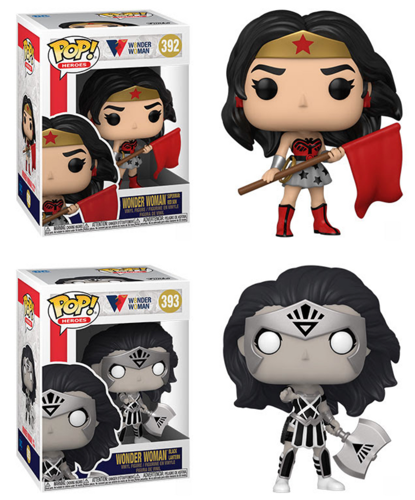 Celebrate the 80th Anniversary of Wonder  Woman with these Funko Pop! figures. Each Pop! measures about 3 3/4" tall and comes packaged in a window box. Collect Wonder Woman from Superman: Red Son, and Wonder Woman Black Lantern.