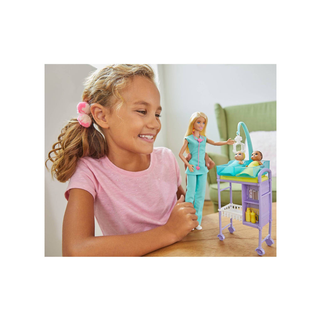 Explore a world of caretaking fun with the Barbie Baby Doctor playset! When a girl plays with Barbie, she imagines everything she can become, and if you love taking care of babies, you can be a baby doctor! This playset includes a baby doctor environment featuring the Barbie Baby Doctor doll and her adorable baby doll patients! Baby doctors are kind and smart and help babies stay happy and healthy. This playset features a stand-alone examination table with lotion bottle and other accessories, an overhead mobile and two compartments for the baby doll patients. Barbie Baby Doctor doll can listen to the babies' heartbeats with her stethoscope and note it down on her chart. They are doing great! Playset includes the Barbie Baby Doctor doll wearing light green "scrubs," with her stethoscope and chart, and 2 baby doll patients each wrapped in cozy blankets. Toy play items include: the examination table with lotion bottle and other accessories, overhead mobile and clear compartments for the baby doll patients. Kids will love the endless possibilities for creative expression and storytelling fun! Doll cannot stand alone. Colors and decorations may vary. For ages 3 and up.