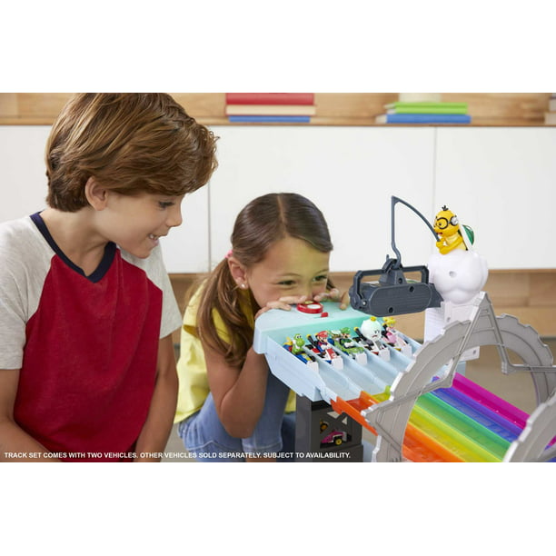 - Experience the iconic Mario Kart Rainbow Road course in the real world with the Hot Wheels Mario Kart Rainbow Road Raceway track set!