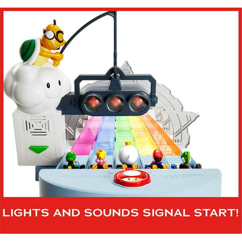 Hot Wheels and Mario Kart bring a dramatic video game level to life with the most iconic and final course in the franchise--Rainbow Road! The 8-foot long track has five translucent rainbow-colored race lanes that can be configured straight or curved. Kids can use the electronic fair start gate to race up to five favorite Mario Kart 1:64 scale die-cast karts. The track set comes with two vehicles: an exclusive King Boo and Mario. Once the karts get racing, they may face banked turns or a wavy road and must pass through the Item Box randomizer to win! Lights and sounds announce the winner at the finish gate. Makes a great gift for kids ages 4 years and older, especially fans of Mario Kart! Colors and decorations may vary.