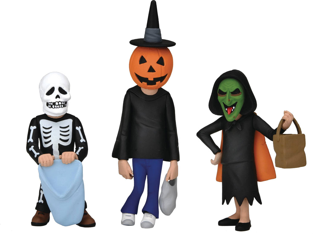 From NECA. NECA's adorably creepy Toony Terrors line welcomes Halloween 3: Season of the Witch! Bring the fun of Saturday morning cartoons to your collection with this stylized action figure 3-pack. It contains 6" scale versions of the iconic trick-or-treaters from the 1982 horror movie. Comes in window box packaging with a bonus cutout backdrop.