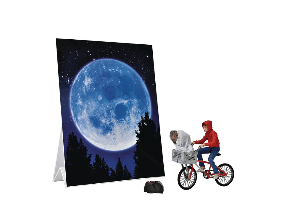 From NECA. For the 40th anniversary of the beloved classic, bring the magic and excitement of E.T. The Extra-Terrestrial into your world. As your friendship with E.T. grows, relive all of his earthly encounters or look to the stars and create your own unforgettable interactive adventures. E.T. and Elliott on Bicycle features pull-back-and-go action! And to re-create the famous flying scene, you can attach the figure to a freestanding movie backdrop for an iconic image. The 7" scale figure (approximately 5" long) comes in display-friendly 40th anniversary window box packaging with opening front flap.