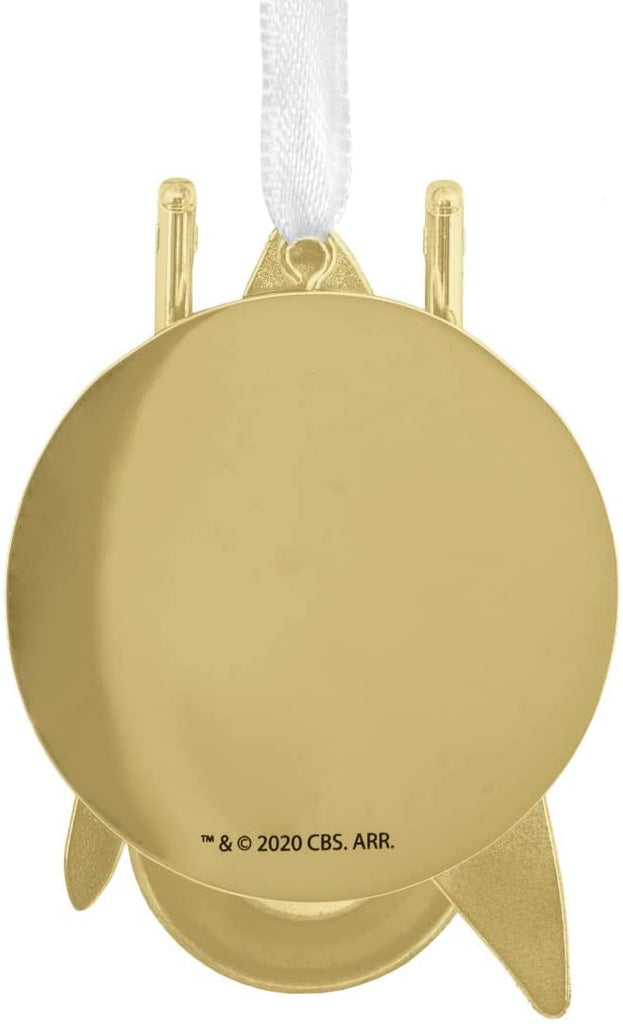 Beam up holiday adventure with this Star Trek Christmas tree ornament. An homage to the classic series, this metal decoration features the flagship of Starfleet—U.S.S. Enterprise NCC-1701—emerging from the iconic Starfleet insignia with shiny metallic gold accents.