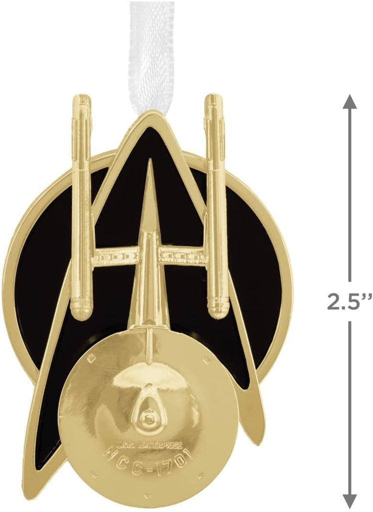 - Beam up holiday adventure with this metal Star Trek Christmas tree ornament. Design features the U.S.S. Enterprise NCC-1701 with the iconic Starfleet insignia and shiny metallic gold accents.