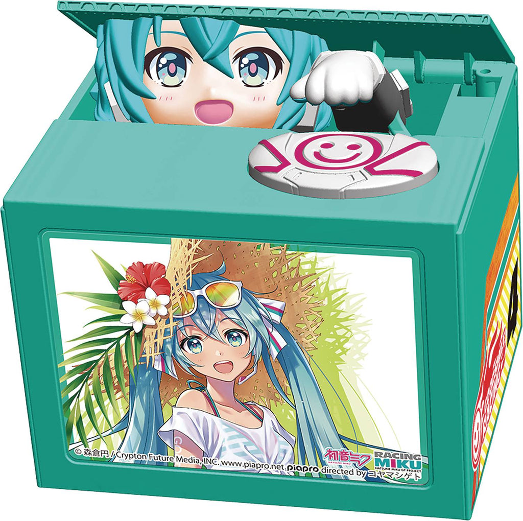 From Shine. The third set of talking and moving Racing Miku coin banks, this time featuring En Morikura's Racing Miku 2021 Ver.! Place a coin down and Racing Miku will peek out from the box and take your coin! She'll say all kinds of phrases or even sing as she moves her hand to take your coin!