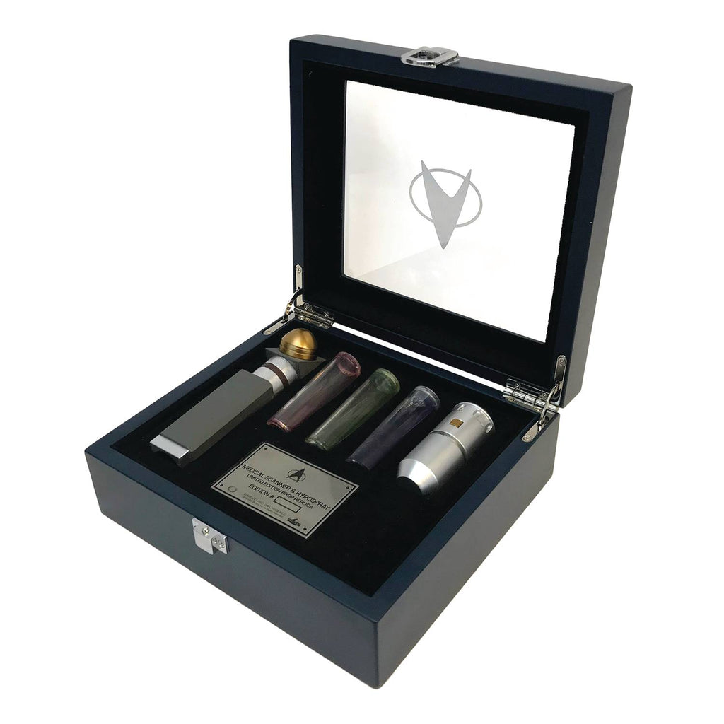 From Factory Entertainment. Factory Entertainment's TNG Medical Set Replica has been copied directly from surviving resources in the CBS archives to ensure accuracy! This 1:1 scale set replicates two iconic props used by 24th century physicians in Star Trek: The Next Generation. It consists of a Hypospray (with interchangeable vials) and a Hand Scanner. Both feature electronic light and/or sound effects and are crafted with heavy diecast metal bodies. Each numbered limited edition museum quality replica set comes with a wooden presentation case, cast metal plaque and a certificate of authenticity/prop story booklet and will make a fine addition to any Star Trek collection. The Hypospray and the Hand Scanner each operate on three LR44 batteries (included).