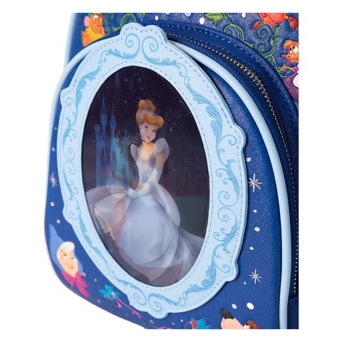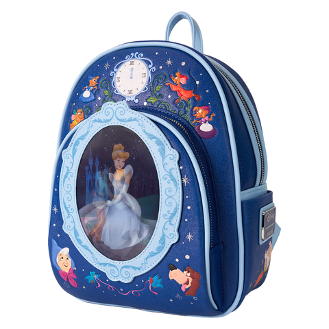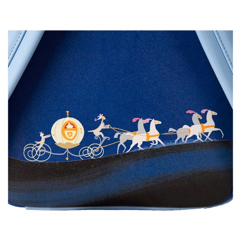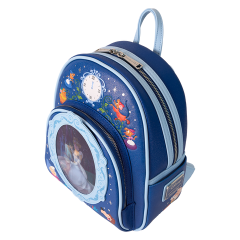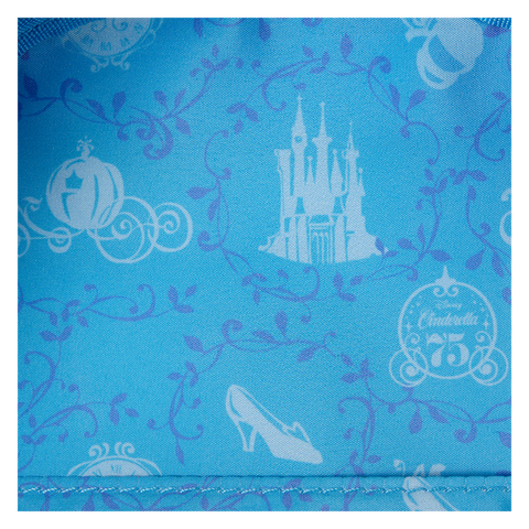 Step into your glass slippers and have a ball! This Disney’s Cinderella mini backpack is ready to make a star-studded entrance for a 75th-anniversary celebration. The front pocket features an applique cameo-shaped window, and inside, lenticular details reveal two different scenes: Cinderella dancing with Disney’s Prince Charming and Cinderella, in front of the castle, all dressed up in blue. At the top, an embroidered clock strikes 12, and fan-favorite characters come to life in print and embroidered detail. Pack just what you need for the day—or an evening outing—of magical adventures.