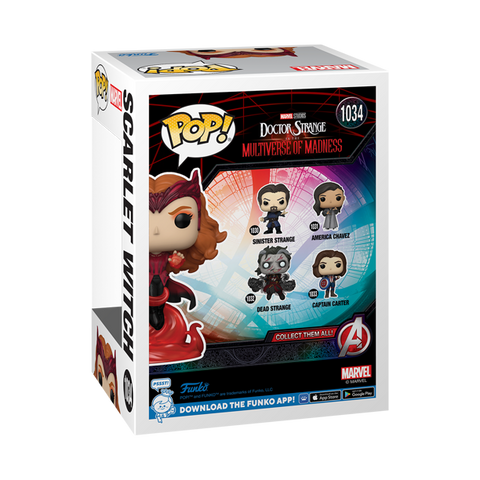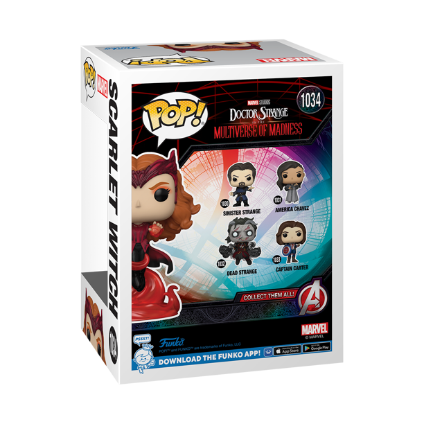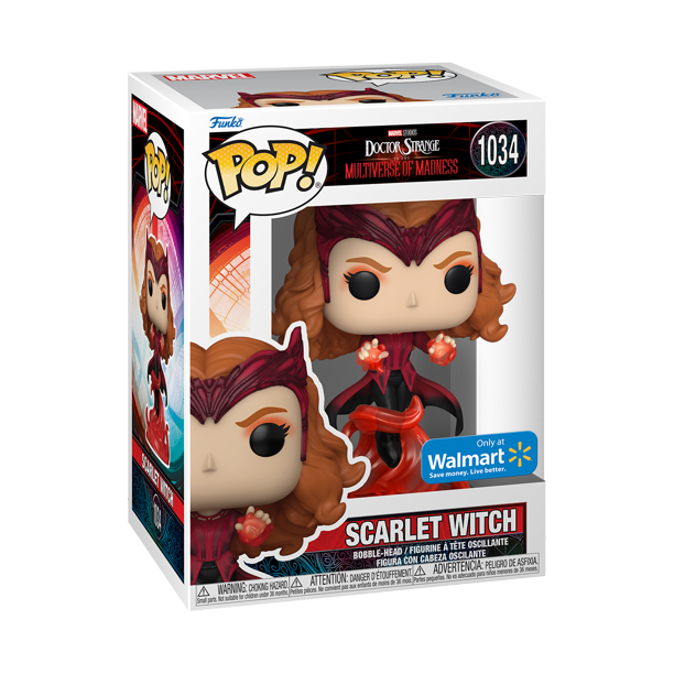 -1 Funko Pop! Marvel: Doctor Strange in the Multiverse of Madness  - Scarlet Witch Vinyl Bobblehead (WALMART EXCLUSIVE): Test the limits of reality and leap into the Marvel multiverse with the exclusive Pop! Scarlet Witch from Marvel Studios’ Doctor Strange in the Multiverse of Madness! Pop! Scarlet Witch rises as she summons her powers, which turn red in her hands. Capture her for your collection. Vinyl bobblehead is approximately 5-inches tall.