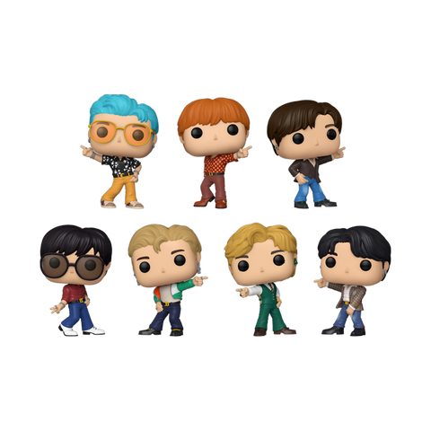 Make some room in your music collection of Pop! figures for BTS! This Pop! BTS - Dynamite 7-Pack includes: Pop! RM, Pop! Jin, Pop! SUGA, Pop! j-hope, Pop! Jimin, Pop! V, and Pop! Jung Kook! Invite all seven members of BTS as Funko Pop! figures to stage a performance in your collection. Vinyl figures range in height, from approximately 4-inches to 4.15-inches tall.
