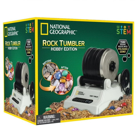 Great way to start a rock collection! Learn about the exciting hobby of rock tumbling with National Geographic. This rock tumbler set includes all the accessories youll need to start polishing dazzling gems. Rock tumbling is tons of fun and a great way to start an extraordinary rock collection. Kids can use the included jewelry fastening to create beautiful homemade jewelry! Contents and Features: High-quality tumbling machine with powerful motor that will last for years. Automatic shut-off timer so you can set it and forget it. Noise reducing leak-proof barrel with stainless steel lid. Half pound of gemstones from around the world (9 types) and four grades of grit Jewelry fastenings so you can create your own unique jewelry. Full-color information guide with cool facts about each of the gemstones included. Easy-to-follow rock tumbling instructions. 2-year manufacturer warranty. Rock tumbling is a fun activity for children of all ages and promotes an interest in geology and science. Introduce your kid to science the fun way! Join National Geographic as we inspire future generations by showing them the wonders of the natural world. National Geographic Toys is proud to provide a 100% satisfaction guarantee with all our products so that you can buy with confidence. About the National Geographic Society With a mission to inspire people to care about the planet, the 126-year-old National Geographic Society is one of the worlds largest nonprofit scientific and educational organizations. National Geographics net proceeds support vital exploration, conservation, research, and education programs.