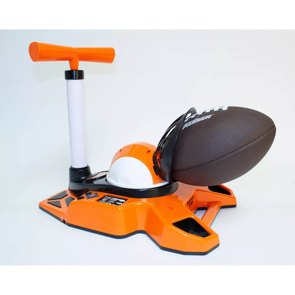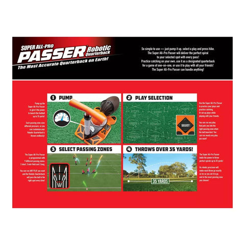 Introducing the Super All-Pro Passer Robotic Quarterback, the most accurate quarterback on earth! Super All-Pro Passer can launch a ball more than 35 yards – 10 yards farther than the original All-Pro Passer! Perfect for the park or backyard, it lets you practice hundreds of plays. Now featuring a regulation Pee Wee football, Super All-Pro Passer throws a perfect spiral every time! Programmed with the skill, timing and accuracy of a pro quarterback, it lets you choose from nine different passing zones. Just select your play, then press hike, slant, post, short or long. Play one-on-one, three-on-three, or with as many players as you want. You can even practice catching on your own! Requires 4 “C” (1.5V) batteries (not included). Ages 14+.