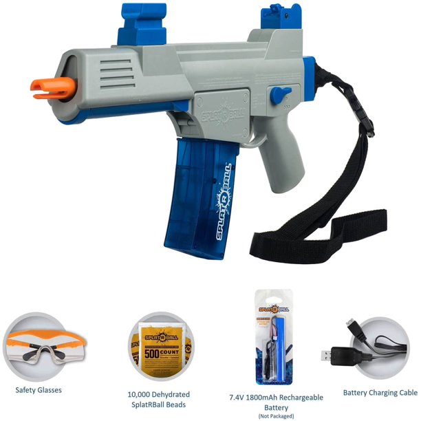 SplatRBall® Full Auto Water Bead Blaster Kit. Shoots Certified 7.5mm SplatRBall® water bead ammo. Kit contains one Blaster, 400 round magazine, sling, sling clip, 10,000 rounds of SplatRBall® , rechargeable 7.4V 1800mAh battery with charging cable, and safety glasses.