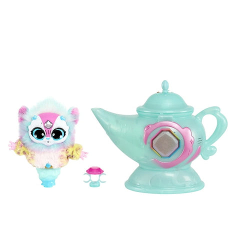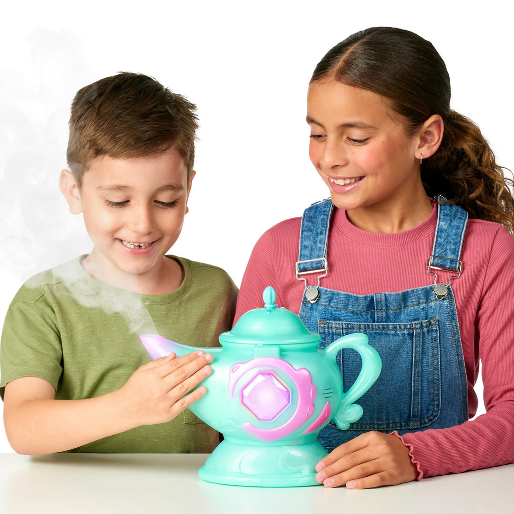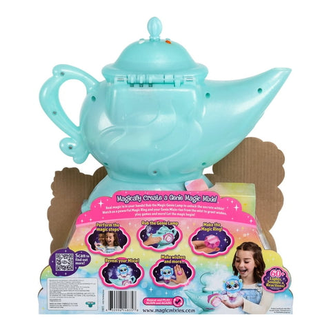 Your wishes have come true! Real magic has returned in the form of the Magic Mixies Magic Genie Lamp! Inside this mysterious teal Magic Lamp is a Genie Mixie waiting to be released! It's time for your child to perform the magic steps and make real magic happen inside this feature packed magical misting Genie Lamp with over 60 different lights, sounds and reactions! First they have to awaken the Genie and create a magic ring that's hidden within. As your child rubs the Lamp, real magical mist appears from the spout and its enchanted gem lights up! Kids will love interacting with the playful Genie Mixie as they discover and unlock the secrets of the Lamp. Once all the challenges are met and the powerful magic ring is placed on your child's finger, they can say the magic words ""Magicus Mixus"" and the Genie Mixie will magically rise out of the Lamp! Remove your cute interactive plush toy genie! The magic and fun has only just begun. When the Genie Mixie is removed from the Lamp, kids can use the magic ring to interact with their Mixie. Once your child names their genie, they can play using the genie's 3 different modes - Wish Granting Mode, Play Mode and Chat Mode. By using their light-up gem on their forehead, the Genie Mixie can grant or deny children's wishes! Genie Mixies love to interact and play when they are touched and also love to chat and cast spells in their own Mixie language! Your Magic Mixies Genie Lamp can be reset so you can perform the misting reveal from inside the Lamp again and again. Kids can reveal their magic Genie Mixie as well as other items from home! A Magical Mist Refill Pack for your Genie Lamp is also available and sold separately so your child can keep the magic alive! Real Magic is just waiting to be revealed. Who will you magically create?