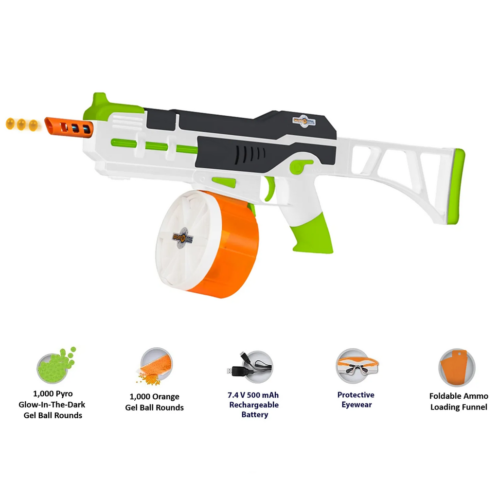 - Complete Water Gel Gun Kit Kit includes: Water bead blaster, 1,200 round water gel drum magazine, 1,000 water ball Splat R Ball ammunition and 1,000 rounds of Glow-in-the-dark Pyro Ammunition, safety glasses, Rechargeable 7.4V 1800mAh battery with charging cable, easy loading funnel and sling clip.