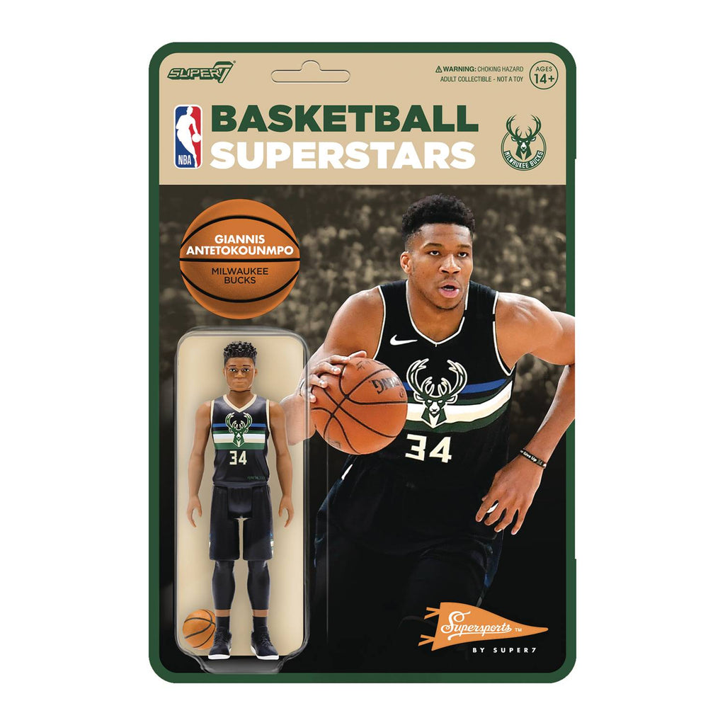 From Super7. No one made a bigger statement last season than Giannis Antetokounmpo by adding the NBA Title and NBA Finals MVP to his growing mountain of accomplishments. This 3.75" scale articulated Giannis Antetokounmpo Supersports figure features the black Milwaukee Bucks Statement Edition uniform and comes with a basketball accessory. Giannis Antetokounmpo and the rest of the NBA Supersports Statement Edition collection are an outstanding way to start or add to your roster!