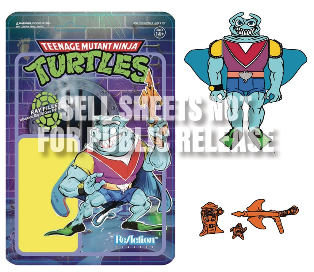 From Super7. Blast to the past with the 1980s stylings of the Teenage Mutant Ninja Turtles ReAction Figures! These plastic action figures are styled to look like classic toys of decades gone by with colorful details that remind you of the figures you may have had as a kid. Each 3.75" scale figure comes with accessories, on a retro style card back featuring brand new illustrations! This Ray Fillet figure comes with Ray Gil Gun, Fish Stix, and Scarfish accessories.