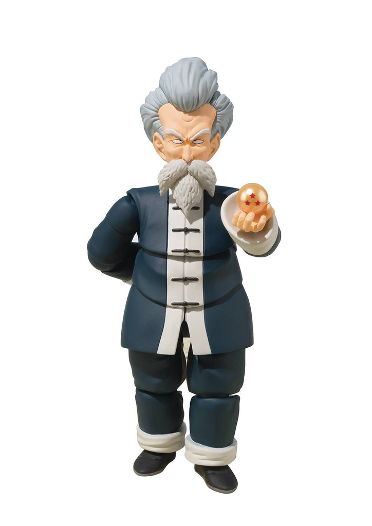From Tamashii Nations. master of Martial Arts Jackie Chun, joins S.H.Figuarts with full action! As well as a funny face, various optional parts ir included to recreate scenes from the comics and TV series! This figure includes two optional face parts, seven optional right hands, six optional left hands, optional arm parts (R/L), a microphone part and the three-star Dragon Ball!