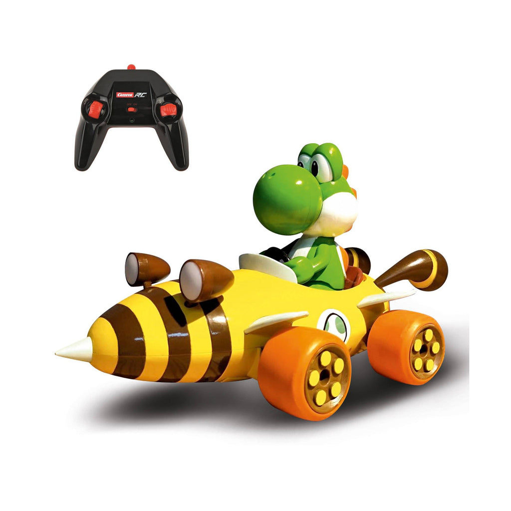 Yoshi shows off his newest vehicle in a stylish bumblebee look in the Carrera RC Mario Kart Bumble V RC car. The 1:18 scale Bumble V features a front and rear suspension with rubber tires and can accelerate up to 5.6-mph on various courses across multiple terrains. Its working rear taillights and front headlights ensure visibility even in the dark. Yoshi can race nonstop for up to 20-minutes on a single 50-minute battery charge with the included 3.2V rechargeable LiFePO4 battery. The use of 2.4GHz technology allows up to 16 cars to be driven simultaneously giving you plenty of competition! A built-in auto-off function ensures that the batteries are protected and the car switches off automatically after 30-minutes of inactivity. Yoshi is ready to run with the remote control batteries included as well.