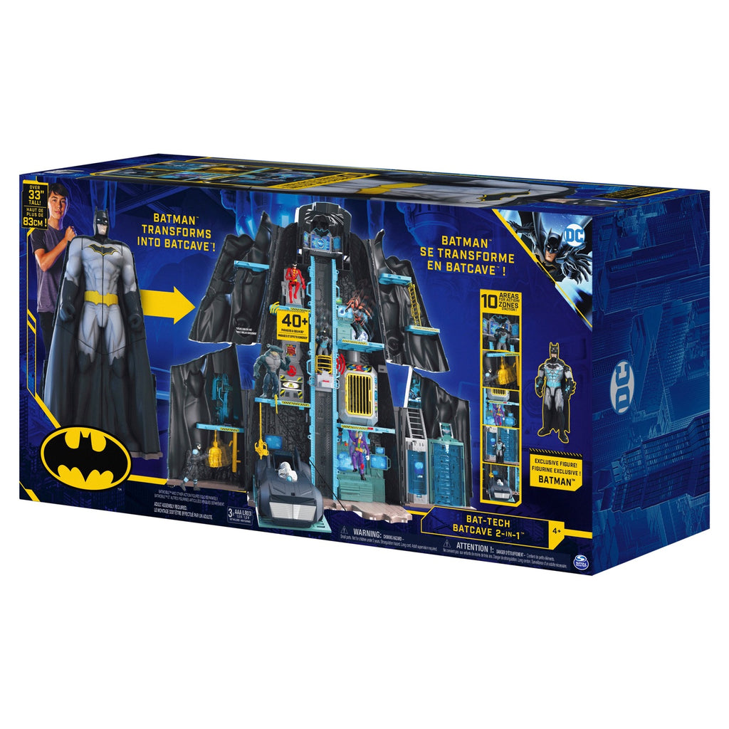 Take your Batman missions to the next level with the Bat-Tech Batcave Playset! The massive Batman is over 33 inches and transforms into an epic Batcave with everything you need to bring your Batman adventures to life! Open it up to reveal the Batcave with over 10 areas for action or close it up to transform it back into a giant Batman for easy storage! The Bat-Tech Batcave Playset is jam-packed with exciting features and includes an exclusive 4-inch Batman action figure and 9 exclusive accessories you won’t find anywhere else. Discover the Batcomputer, Evidence Lab, Dojo, Power Generator, Garage, Elevator, Tool Shop, Jail, Armory and more!