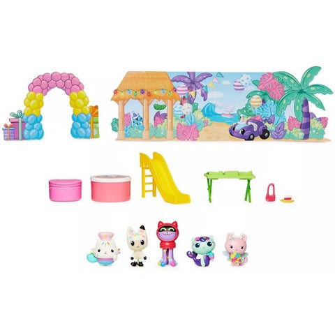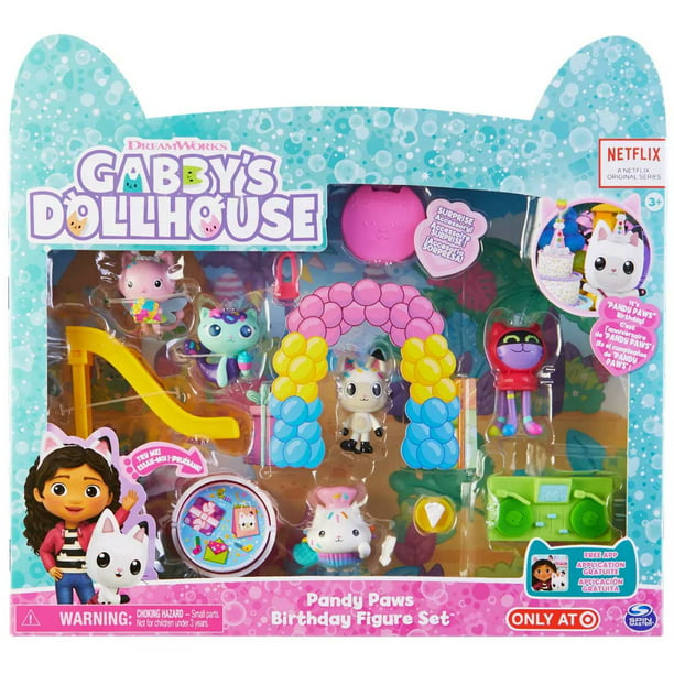 It’s Pandy Paws’ birthday! Celebrate with the Gabby’s Dollhouse Pandy Paws Birthday Figure Set, only at Target! This themed set has everything you need to host a party for Gabby’s best pal. Open the box to find five exclusive collectible figures with birthday details, three furniture pieces, two accessories, chip art décor, a sticker sheet and a Dollhouse Delivery box with a surprise accessory inside! Just like Gabby does in the show, unbox your special Dollhouse Delivery and discover the set’s mystery accessory. What will you find inside? Set up the chip art backdrop and balloon arch to help decorate for the party and gather all the Gabby Cats around. Slide the Pandy Pack accessory onto Pandy Paws and get the party started! Help Daniel James “DJ” Catnip spin some tunes at the turntable – the kitty records really move! Play on the slide with Kitty Fairy, then eat some delicious pie at the table, baked by Cakey Cat. The table flips around, revealing birthday-themed treats and gifts on each side! Snap Pandy Paws and MerCat’s photo under the balloon arch and continue the birthday fun all day long! Expand your Gabby’s Dollhouse world and use the Birthday Figure Set with Gabby’s Purrfect Dollhouse (sold separately). For one last surprise, scan the QR code inside the Dollhouse Delivery to unlock a special reward in the free Gabby’s Dollhouse App (available on iOS and Android). The Pandy Paws Birthday Figure Set is the perfect gift for kids and fans of the show. Bring home the Gabby’s Dollhouse Pandy Paws Birthday Figure Set and host a cat-tastic birthday celebration!