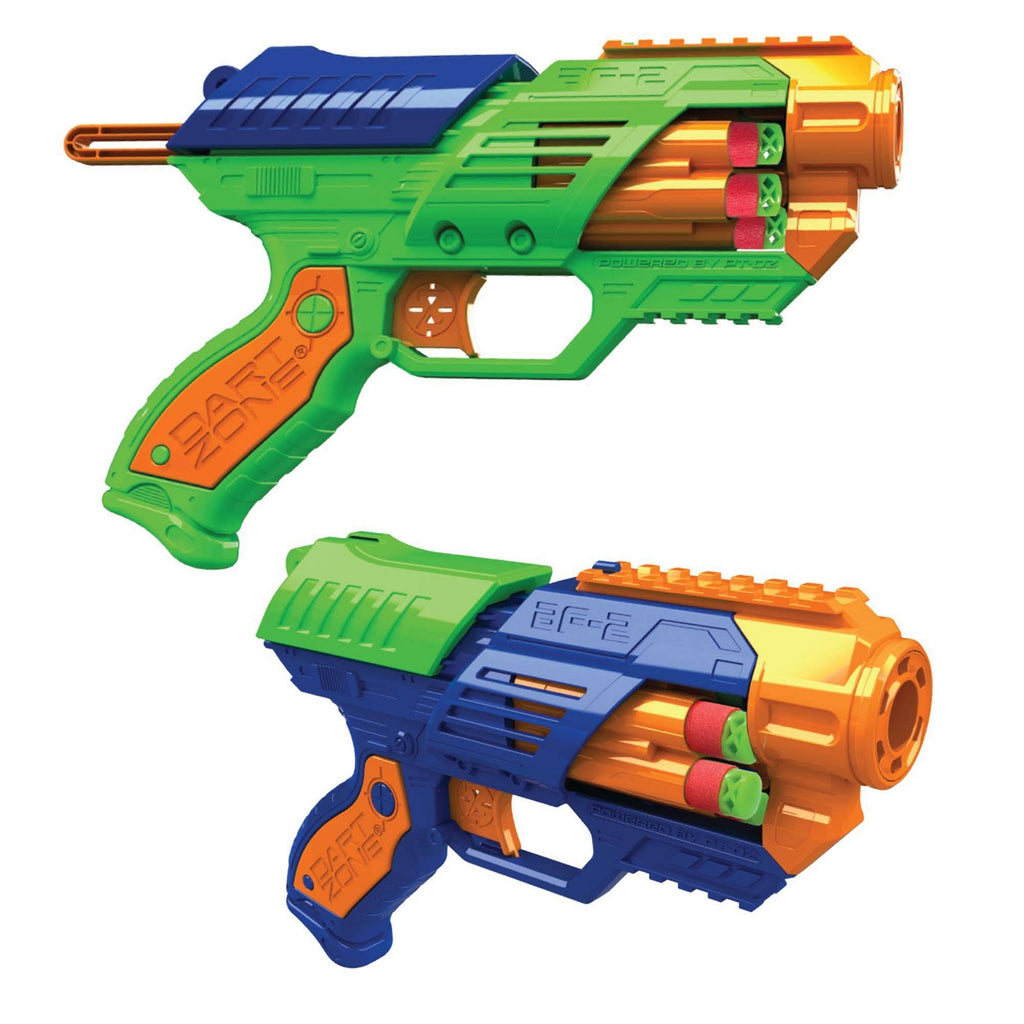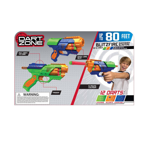 The Dart Zone® BlitzFire X2 Quickshot Dart Blasters are double-packed with action! Snag two quick-load dart blasters in one package, so you can stay two steps ahead of the competition. Each blaster features an auto-advance rotating cylinder for rapid-fire blasting, delivering high-powered performance at a great value. The set includes 2 Blitzfire X2 Blasters and 12 new red diamond tip darts. Keep your rivals on their toes in the heat of any dart battle with 6-round, auto-advance rotating cylinders and darts that fly up to 80 feet! The Blitzfire X2 comes with high-accuracy diamond tip foam darts, which are compatible with the entire Dart Zone Blaster lineup and most standard blasters. Get the Dart Zone® Blitzfire X2 Quickshot Blaster 2-Pack and stay on top of the Dart Blaster game. Recommended for ages 8+