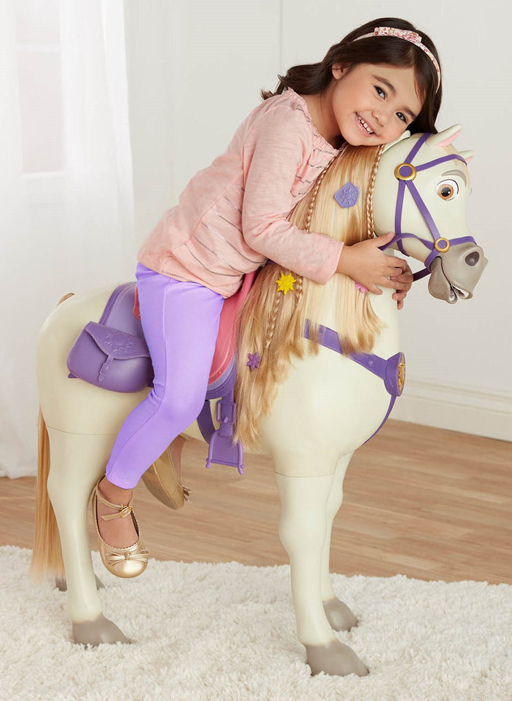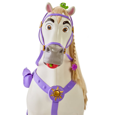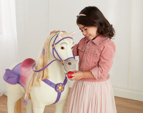 Giddy up and get ready for exciting adventures with Playdate Maximus when you sit on his back and pull on his reins as he responds by moving his head and makes realistic horse sounds. Pull twice and Maximus will make a “trotting” sound. Offer Maximus his included apple and he can hold it in his mouth and make “chomping” sounds. Decorate his beautiful mane with the wear & share hair accessories and brush for hair play fun! He even comes with a saddlebag for storage. For even more fun, Playdate Rapunzel can also sit on Maximus with you or by herself.